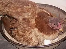 Broodiness is the action or behavioral tendency to sit on a clutch of eggs to incubate them, often requiring the non-expression of many other behaviors including feeding and drinking.[1] Being broody has been defined as "Being in a state of readiness to brood eggs that is characterized by cessation of laying and by marked changes in behavior and physiology".[2] Broody birds often pluck feathers from their chest and abdomen, using them to cover the eggs. As a consequence of this, they develop one or several patches of bare skin on the ventral surface. These reddish, well-vascularized areas of skin are usually called brood patches, and improve heat transfer to the eggs. Broodiness is usually associated with female birds, although males of some bird species become broody and some non-avian animals also show broodiness.