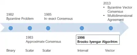 The Brooks–Iyengar hybrid algorithm for distributed control in the presence of noisy data combines Byzantine agreement with sensor fusion. It bridges the gap between sensor fusion and Byzantine fault tolerance.[4] This seminal algorithm unified these disparate fields for the first time. Essentially, it combines Dolev's[5] algorithm for approximate agreement with Mahaney and Schneider's fast convergence algorithm (FCA). The algorithm assumes N processing elements (PEs), t of which are faulty and can behave maliciously. It takes as input either real values with inherent inaccuracy or noise (which can be unknown), or a real value with apriori defined uncertainty, or an interval. The output of the algorithm is a real value with an explicitly specified accuracy. The algorithm runs in O(NlogN) where N is the number of PEs. It is possible to modify this algorithm to correspond to Crusader's Convergence Algorithm (CCA),[6] however, the bandwidth requirement will also increase. The algorithm has applications in distributed control, software reliability, High-performance computing, etc.[7]