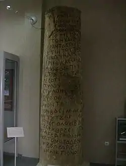 Very little is known about the religion of the Bulgars,[143][144] but it is believed to have been monotheistic. In Greek language inscriptions from pagan Danube Bulgaria, Bulgar monarchs describe themselves as "ruler from God",[118][145][146] indicating authority from a divine origin,[147] and making an appeal to the deity's omniscience.[148] Presian's inscription from Philippi (837) states:[149]