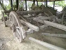On steep hills bullock teams often required additional assistance to negotiate these inclines. This assistance was provided by hitching two or more teams together for the ascent. On steep descents logs or trees were dragged behind the dray, wagon or jinker to slow the load's descent and protect the team from injury.[4] Shanties and villages grew to serve the needs of the road's users at the site of difficult range and river crossings where teams met.[1]