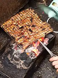 Bún chả (Vietnamese: [ɓǔn ca᷉ː]) is a Vietnamese dish of grilled pork and noodle, which is thought to have originated from Hanoi, Vietnam.[1] Bún chả is served with grilled fatty pork (chả) over a plate of white rice noodle (bún) and herbs with a side dish of dipping sauce. The dish was described in 1959 by Vietnamese food writer Vu Bang (1913–1984) who described Hanoi as a town "transfixed by bún chả." Hanoi's first bún chả restaurant was on Gia Ngư, Hoàn Kiếm District, in Hanoi's Old Quarter.[2][3][4]
