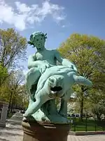 The bronze sculpture sits on a circular base in the middle of the basin.[1] The sculpture is officially known as Boy with a Turtle,[1] as its figure is of a young boy, in the nude, riding a sea turtle.[1] In 1986 the Worcester municipal parks and recreation department described the statue with the sentence, "The boy holding the turtle, his hair flying, a sly smile on his face, is charming and disarming."[2]