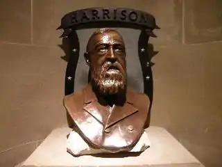 The bust was commissioned by the Indiana General Assembly in 2007 in House Bill 1818, which also commissions artwork based on the contributions of African Americans to be placed in the statehouse. The bill "requires the department to commission a bust of President Benjamin Harrison for display in the state capitol. Requires the department to consult with the historical bureau and the arts commission on the design of the bust. Requires the approval of the legislative council before the bust is placed in the state capitol."[3] The sponsors of the bill were Representatives V. Smith, M. Murphy, C. Brown; and Senators J. Merritt, E. Rogers, S. Smith, B. Breaux, and G. Howard.[2]
