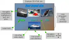 CE-HTML is part of the CEA-2014 standard (also referred to as "Web4CE" which is short for Web for Consumer Electronics),[2] defined within the Consumer Electronics Association (CEA).[3]