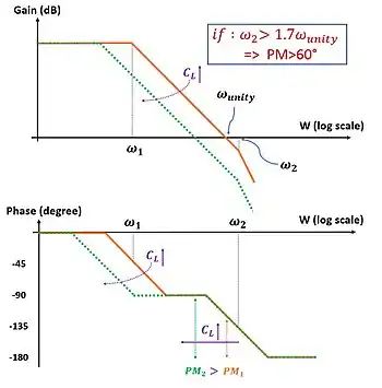 In many applications, an amplifier drives a capacitor as a load. In some applications, like switched capacitor circuits, the value of capacitive load changes in different cycles. Therefore, it affects output node time constant and amplifier frequency response. Stable behavior of amplifier for all possible capacitive loads is necessary, and designer must consider this issue during designing of circuit. Designer should ensure that phase margin (PM) of the circuit is enough for the worst case. To have proper circuit behavior and time response, designers usually consider a PM of 60 degrees. for higher PM values, the circuit is more stable, but it takes longer for the output voltage to reach its final value.[1][2][3] In telescopic, and FC amplifiers, the dominant pole is at the output nodes. Also, there is a non-dominant pole at the cascode node.[3] Since capacitive load connected to output nodes, its value affects the location of the dominant pole. This figure shows how capacitive load affects the location of dominant pole and stability. Increasing capacitive load moves the dominant pole toward the origin, and since unity gain frequency is (amplifier gain) times of it also moves toward the origin. Therefore, PM increases, which improves stability. So, if we ensure stability of a circuit for a minimum capacitive load, it remains stable for larger load values.[2][3] To achieve greater than 60 degrees PM, the non-dominant pole must be greater than 1.7 times of