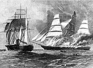 Illustration from Harper's Weekly in 1863 of CSS Florida (left) burning the clipper Jacob Bell (right) off the West Indies on 13 February 1863. She had captured Jacob Bell the previous day.
