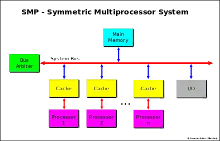 The bottleneck of these systems is the traffic and the Memory bandwidth. Bandwidth can be increasing by using large data bus path, data crossbar, memory interleaving (multi-bank parallel access) and out of order data transaction. The traffic can reduced by using a cache that acts as a "filter" versus the shared memory, that is the cache is an essential element for shared-memory in SMP systems.