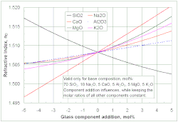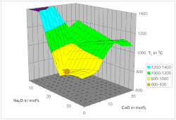 At the beginning of glass research it was most important to know the relation between the glass composition and its properties. For this purpose Otto Schott introduced the additivity principle in several publications for calculation of glass properties.[4][5][6] This principle implies that the relation between the glass composition and a specific property is linear to all glass component concentrations, assuming an ideal mixture, with Ci and bi representing specific glass component concentrations and related coefficients respectively in the equation below. The additivity principle is a simplification and only valid within narrow composition ranges as seen in the displayed diagrams for the refractive index and the viscosity. Nevertheless, the application of the additivity principle lead the way to many of Schott’s inventions, including optical glasses, glasses with low thermal expansion for cooking and laboratory ware (Duran), and glasses with reduced freezing point depression for mercury thermometers. Subsequently, English[7] and Gehlhoff et al.[8] published similar additive glass property calculation models. Schott’s additivity principle is still widely in use today in glass research and technology.[9][10]