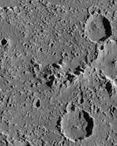 On a sub-kilometer scale the surface of Callisto is more degraded than the surfaces of other icy Galilean moons.[6] Typically there is a deficit of small impact craters with diameters less than 1 km as compared with, for instance, the dark plains on Ganymede.[18] Instead of small craters, the almost ubiquitous surface features are small knobs and pits.[6] The knobs are thought to represent remnants of crater rims degraded by an as-yet uncertain process.[19] The most likely candidate process is the slow sublimation of ice, which is enabled by a temperature of up to 165 K, reached at a subsolar point.[6] Such sublimation of water or other volatiles from the dirty ice that is the bedrock causes its decomposition. The non-ice remnants form debris avalanches descending from the slopes of the crater walls.[19] Such avalanches are often observed near and inside impact craters and termed "debris aprons".[6][18][19] Sometimes crater walls are cut by sinuous valley-like incisions called "gullies", which resemble certain Martian surface features.[6] In the ice sublimation hypothesis, the low-lying dark material is interpreted as a blanket of primarily non-ice debris, which originated from the degraded rims of craters and has covered a predominantly icy bedrock.