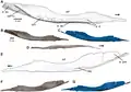 The size of the holotype specimen is difficult to assess, as the two most characteristic elements of the skeleton, the skull and the humerus, are proportionally unusual. Estimating body size from the skull predicts a much larger humerus, and estimating it from the humerus predicts a much smaller skull. This may indicate that the skull was unusually large, the forelimbs were unusually small, or both. Roughly scaling from local crocodylomorph taxa such as Dromicosuchus and an undescribed species (specimen NCSM 21722), Zanno et al. (2015) provided an estimated length of 3 m (9.8 ft). However, it likely grew larger, as the holotype specimen was immature owing to the unossified neurocentral canals.[1] Along with Redondavenator and CM 73372 (another undescribed species), Carnufex was among the largest Triassic crocodylomorphs. These three were among the earliest crocodylomorphs, casting doubt on the hypothesis that characteristic crocodylomorph features evolved after a reduction in body size, rather than before.[2] Carnufex possesses a myriad of features characteristic of both crocodylomorphs and their more distant ancestors, reptiles like Postosuchus. However, it is also highly autapomorphic, meaning that it possessed many other features which are completely unique to it, distinguishing it from its close relatives.[4] The skull was large, elongated, and heavily textured in some areas, while the forelimbs were small.[1][4]