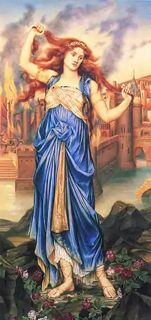 Cassandra foresaw the destruction of Troy. In various accounts of the war, she warned the Trojans about the Greeks hiding inside the Trojan Horse, Agamemnon's death, her own demise at the hands of Aegisthus and Clytemnestra, her mother Hecuba's fate, Odysseus's ten-year wanderings before returning to his home, and the murder of Aegisthus and Clytemnestra by the latter's children Electra and Orestes. Cassandra predicted that her cousin Aeneas would escape during the fall of Troy and found a new nation in Rome.[13] However, her warnings were all disregarded.[14]