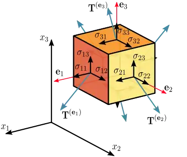 In continuum mechanics, the Cauchy stress tensor , true stress tensor,[1] or simply called the stress tensor is a second order tensor named after Augustin-Louis Cauchy. The tensor consists of nine components that completely define the state of stress at a point inside a material in the deformed state, placement, or configuration. The tensor relates a unit-length direction vector n to the traction vector T(n) across an imaginary surface perpendicular to n: