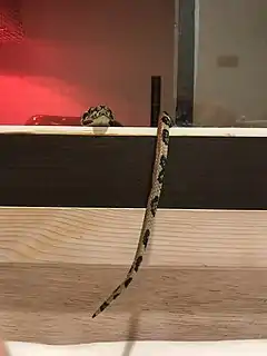 Caudal luring behavior is found in over 50 different snake species.[4] It is most common in boas, pythons, tropidophiids, colubrids and elapids of the genus Acanthophis.[5][6] It is, however, the most obvious in vipers and pit vipers, especially in rattlesnakes.[7] As the snake is waiting for its prey, it is coiled up and has its distinctively marked tail elevated, visible and moving in a way that captures the attention of its prey. Once the prey is in striking range, the snake captures the prey. Due to the tail resembling a writhing caterpillar and another worm-like insect larvae, the tail of the snake is often referred to as a vermiform.[4] One elaborate example of caudal luring occurs in the spider-tailed horned viper, which employs a highly modified tail to mimic a spider's form and locomotion.[8]
