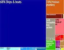 The economy of the Cayman Islands is dominated by financial services and tourism, together accounting for 50-60% of Gross Domestic Product.[50] The nation's low tax rates have led to it being used as a tax haven for corporations; there are 100,000 companies registered in the Cayman Islands, more than the population itself. The Cayman Islands have come under criticism for allegations of money laundering and other financial crimes, including a 2016 statement by former US president Barack Obama of a particular building as "tax scam" for housing 12,000 corporations.[51]