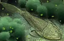 Because its mouth was situated directly beneath its head, Cephalaspis was thought of as being a bottom-feeder, akin to a heavily armoured catfish or sturgeon. It moved its plow-like head from side to side, Cephalaspis easily stirring sand and dust into the water, along with revealing the hiding places of its prey, digging up worms or crustaceans hidden in the mud and algae, as well as sifting through detritus (inferred from its lack of jaws and inability to bite).[2]