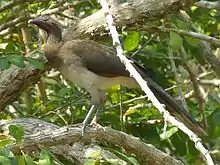 Chachalacas are galliform birds from the genus Ortalis. These birds are found in wooded habitats in the far southern United States (Texas),[1][2] Mexico, and Central and South America. They are social, can be very noisy and often remain fairly common even near humans, as their relatively small size makes them less desirable to hunters than their larger relatives. As agricultural pests, they have a ravenous appetite for tomatoes, melons, beans, and radishes and can ravage a small garden in short order. They travel in packs of six to twelve.[3] They somewhat resemble the guans, and the two have commonly been placed in a subfamily together, though the chachalacas are probably closer to the curassows.[4]