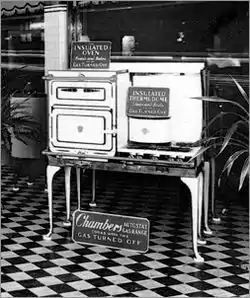 The Chambers Fireless Gas Range was a gas cook stove created by John E. Chambers in 1910,[1][2] Two years after inventing his fireless cooker, John Chambers organized the Chambers Company in 1912.[1] Chambers' patented method of manufacture[3] used thick rock wool insulation to insulate the oven on all sides. This made it possible for the heat inside the oven to build up over a short period of time. The gas was then turned off, causing a series of internal dampers to close, which effectively isolated the oven compartment from the outside air. The food would continue to cook on retained heat, thus conserving fuel and reducing food shrinkage. This method of cooking, Chambers literature often claimed, also increased the food value of the cooked items.