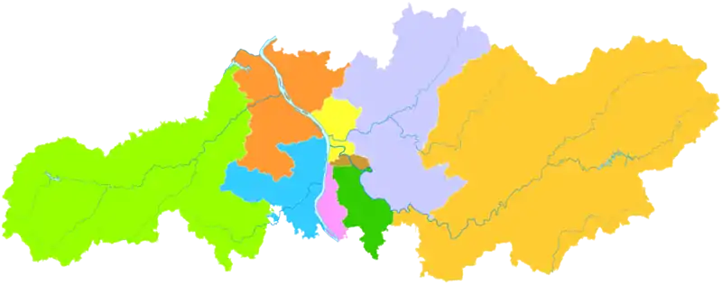 Most of the rivers in Changsha belong to the Xiang River system. In addition to the Xiangjiang River, 15 tributaries flow into the Xiang, mainly including Liuyang River, Laodao River, Minjiang River, and Qinshui River.[37] 302 tributaries are more than five kilometers long, including 289 in the Xiang River Basin. According to the tributary grading there are 24 primary tributaries, 128 secondary tributaries, 118 third tributaries, and 32 tributaries; and 13 are Zijiang water systems; a fairly complete water system is formed, and the river network is densely distributed. Hydrological characteristics of Changsha: the water system is complete, the river network dense; the water volume greater, the water energy resources abundant; the winter not frozen, and the sediment content small.[38]