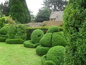 To the east of this was the Pleasaunce or Pleasure Garden. This was the Best Garden, which was levelled, but with a viewing terrace along one side which also gave entrance to the church at the opposite end. The design of this garden is not known, but it was almost certainly surrounded by high walls with fruit trees trained against it. The Best Garden was laid out in the circular pattern we see today by Dorothy Whitmore Jones in 1833,[10] although it is suggested that there were already box plants there. Beds were added within the circular hedge in the 1890s or 1900s and then grassed over again by 1972. During the periods of time when money came into the family the planting in this garden was always renewed.