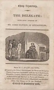 The individual tracts have a complex bibliographical history often going through many editions and involving several different individuals who were designated 'Printer to the Cheap Repository,' together with many distributors and publishers. Retail sales were made by 'booksellers, newsmen, and hawkers, in town and country.'[7] The most important printers involved were Samuel Hazard of Bath; John Marshall of London, William Watson of Dublin; and John Evans of 42 Long Lane, London. Several copies were also reprinted in the U.S.A. by printers in both New York and Philadelphia. Until the end of 1798 the publisher undertaking the work was 'The Cheap Repository', but thereafter the copyrights of the official tracts were sold and later collected editions were published by John and James Rivington (publishers) for the Society for Promoting Christian Knowledge (S.P.C.K.)