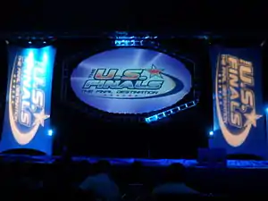 As of 2020, all-star cheerleading, as sanctioned by the USASF, involves a squad of 5–36 females and males. All-star cheerleaders are placed into divisions, which are grouped based upon age, size of the team, gender of participants, and ability level. The age groups vary from under 4 years of age to 18 years and over. The squad prepares year-round for many different competition appearances, but they actually perform only for up to 2½ minutes during their team's routine. The numbers of competitions a team participates in varies from team to team, but generally, most teams tend to participate in six to ten competitions a year. These competitions include locals or regionals, which normally take place in school gymnasiums or local venues, nationals, hosted in large venues all around the U.S., and the Cheerleading Worlds, which takes place at Walt Disney World in Orlando, Florida. During a competition routine, a squad performs carefully choreographed stunting, tumbling, jumping, and dancing to their own custom music. Teams create their routines to an eight-count system and apply that to the music so that the team members execute the elements with precise timing and synchronization.