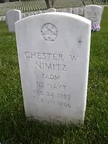 In late 1965, Nimitz suffered a stroke, complicated by pneumonia. In January 1966, he left the U.S. Naval Hospital (Oak Knoll) in Oakland to return home to his naval quarters. He died at home at age 80 on the evening of February 20 at Quarters One on Yerba Buena Island in San Francisco Bay.[42] His funeral on February 24 was at the chapel of adjacent Naval Station Treasure Island, and Nimitz was buried with full military honors at Golden Gate National Cemetery in San Bruno.[43][44][45][46] He lies alongside his wife and his long-term friends Admiral Raymond A. Spruance, Admiral Richmond K. Turner, and Admiral Charles A. Lockwood and their wives, an arrangement made by all of them while living.[47]
