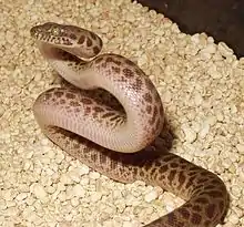 Children's python (Antaresia childreni) is a species of nonvenomous snake in the family Pythonidae. The species is named after John George Children. It is a nocturnal species occurring in the northern half of Australia and generally found on the ground, although it often climbs trees. Usually growing to about 1.0 m (3 ft) in length, it is typically a reddish-brown colour, darker on the upper surface, and with many darker blotches, especially on younger specimens. It feeds mostly on small mammals and birds, and as with other pythons, it constricts its prey before swallowing it whole. It is a popular pet among reptile enthusiasts.