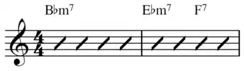 Slash notation is a form of purposefully vague musical notation which indicates or requires that an accompaniment player or players improvise their own rhythm pattern or comp according to the chord symbol given above the staff. On the staff a slash is placed on each beat (so that there are four slashes per measure in 4/4 time).[1]