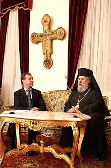 Chrysostomos II was received in a historic private audience with Pope Benedict XVI in the Vatican, on 16 June 2007.[11] Their discussions involved the safety of Christians in the Middle East as a result of an ongoing political tension between warring countries. They had another meeting on 28 March 2011.[12][13]