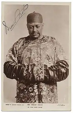 The success of the "Arabian Nights" adaptation Kismet, a 1911 play by Edward Knoblock, inspired Oscar Asche to write and produce Chu Chin Chow. Asche directed the musical and played the lead role of Abu Hasan, leader of the forty thieves (the "Chu Chin Chow" of the title refers to the robber chief when impersonating one of his victims). Besides Asche, the production starred his wife, Lily Brayton, and the former D'Oyly Carte Opera Company star Courtice Pounds. Costumes were by the designer Percy Anderson.[6]