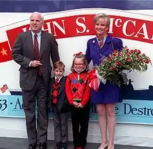She moved back to Arizona in early 1984[13] and gave birth to the couple's daughter Meghan later that year.[13] She subsequently gave birth to sons John Sidney IV (known as "Jack") in 1986 and James (known as "Jimmy") in 1988.[33] Their fourth child, Bridget, was adopted in 1991. McCain's parents lived across the street and helped her raise the children; her husband was frequently in Washington and she typically only saw him on weekends and holidays.[13][22][23] In his absence, she organized elaborate fund-raisers for him and expanded their home.[32]