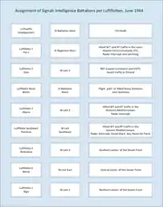 In 1939, after several experiments at reorganization, the fixed and mobile signal intelligence units were combined into Sig Int battalions, removed from the administrative control of Chi-Stelle, and attached to Local Air Force Signal Regiments, in each case as the third battalion of what was primarily a communication regiment. Each signal intelligence battalion was composed of an evaluation unit (the W-Leitstelle), two mobile intercept companies and three fixed intercept stations.[15][14] This decentralization of LNA 350 resulted in the Chi-Stelle losing influence, especially at the outset of the war.[10]