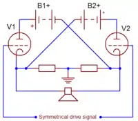 The electrical bridge of a circlotron is formed by a matched pair of triodes (V1, V2) and two floating power supplies ('B batteries'), B1+ and B2+. Grids of each triode are driven in opposite phases with a balanced, symmetrical input signal; differential current flows through the loudspeaker load and a simple, relatively high impedance, resistor network that ties floating supplies to the ground. Tubes are usually fixed biased with an external negative power supply ('C battery'); each side normally has independent bias adjustment to compensate for minor tube mismatch.
