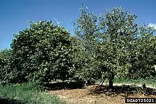 ![]() Healthy tree (left) next to a tree infected with citrus blight (right). Note the infected tree's wilting and sparser foliage. | |