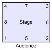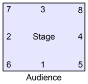 Some classical ballet training systems employ standardized layouts to define reference locations at the corners, and edges of stages, and dance studio rooms. In the latter case, there is no audience and a mirror typically spans the downstage wall of the room (e.g., points 1-2 of the Cecchetti layout).