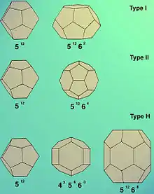 The unit cell of Type I consists of 46 water molecules, forming two types of cages – small and large. The unit cell contains two small cages and six large ones. The small cage has the shape of a pentagonal dodecahedron (512) (which is not a regular dodecahedron) and the large one that of a tetradecahedron, specifically a hexagonal truncated trapezohedron (51262). Together, they form a version of the Weaire–Phelan structure. Typical guests forming Type I hydrates are CO2 in carbon dioxide clathrate and CH4 in methane clathrate.