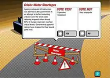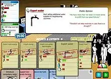 The four resources of the game are money, power, food, and water. Each is measured by a meter in the upper-left corner of the screen and by clicking on any individual item, a graph of the resource over time is displayed. Each turn, a red section on the grey bar shows the estimated amount by which that resource will be reduced, and a green section shows the estimated growth. These bars adjust themselves to the selected policies as they are affected. Most policy cards deplete or grow different resources, and if any of the resource bars are reduced to nothing or are entirely in the red, policy cards requiring that resource become unavailable. When a resource is exhausted by the end of the turn, the player must manage a corresponding disaster the following turn.