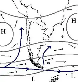 In Zona Sur and the northern part of Zona Austral the climate is Temperate oceanic. Here the Andean Cordillera intercepts moist westerly winds along the Pacific coast during winter and summer months; these winds cool as they ascend the mountains, creating heavy rainfall on the mountains' west-facing slopes. The northward-flowing oceanic Humboldt Current creates humid and foggy conditions near the coast. The tree line is at about 2,400 m in the northern part of the ecoregion (35° S), and descends to 1,000 m in the south of the Valdivian region. In the summer average temperature can climb to 16.5 °C (62 °F), while during winter the temperature can drop below 7 °C (45 °F).[6]