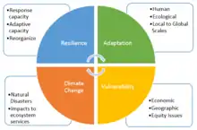 A conversation about climate resilience is incomplete without also incorporating the concepts of adaptations, vulnerability, and climate change. If the definition of resiliency is the ability to recover from a negative event, in this case climate change, then talking about preparations beforehand and strategies for recovery (aka adaptations), as well as populations that are more less capable of developing and implementing a resiliency strategy (aka vulnerable populations) are essential. This is framed under the assumed detrimental impacts of climate change to ecosystems and ecosystem services.[8] It is important to note that efforts to enhance resiliency can result in outcomes that are adaptive, maladaptive, or even both. When considering inequality with adaptation we can focus on distributive justice, the intent of which is to maximize benefits for and promote the engagement of the most disadvantaged communities. Identifying a community or population as vulnerable can lead to biases due to the different factors negotiated in the term vulnerable. Outcome vulnerability (focusing on quantitative measures) and contextual vulnerability (focusing on qualitative measures) are two aspects that must be thought of in unison to achieve a wholistic understanding of a community's vulnerable state. Because one population's level of vulnerability is constantly shifting (as are the threats and impacts of climate change) the efforts to provide adaptive strategies must offer multiple opportunities and outcomes.[9]