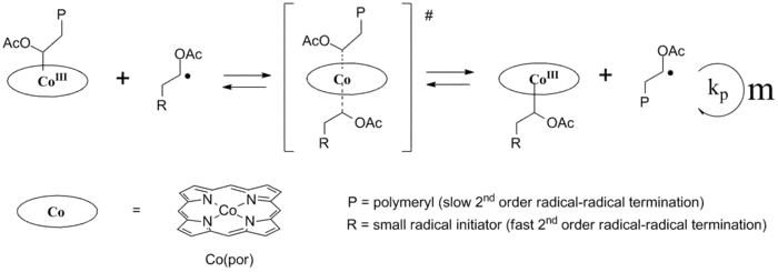 The degenerative transfer mechanism is based on very fast exchange equilibria between small free radicals (being continuously injected into the solution) and dormant polymeryl radicals (protected as closed-shell cobalt species).[7] Systems based on degenerative transfer do not proceed via the persistent radical effect (PRE). Instead an active propagating radical interchanges its role with a latent radical in a dormant complex. The activation of one polymer chain means the deactivation of another polymer chain. If the exchange process is much faster than the polymerisation rate (kp), effectively all polymer chains grow at the same rate. Because the large polymer chains diffuse much slower than the small organic radicals, and thereby terminate much slower via 2nd order radical-radical coupling or disproportionation, long chains effectively build-up at cobalt while the small radicals keep terminating. This leads to a desirable narrow molecular weight distribution of the polymer at high polymerization rates. DT-CMRP is an associative process, which for CoIII(por)(alkyl) species implies formation of a 6-coordinate intermediate or transition state. Such Co(por)(alkyl)2 species formally have a Co(+IV) oxidation state, but in reality their (electronic) structure is best described as a weak radical adduct of a CoIII(por)(alkyl) species.[7] A striking feature of DT-CMRP is the fact that even upon using a large excess of the radical initiator compared to the transfer agent, the radical polymerization reactions still remains controlled.[5] A satisfactory explanation for this phenomenon seems to be lacking at the moment.