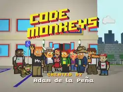 ![]() Code Monkeys title card; main characters from left to right: Black Steve, Dave, Todd, Clare, Jerry, Mary, Mr. Larrity, Dean and Benny. | |