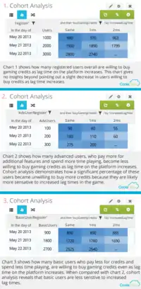 - Perform the cohort analysis. The analysis above was done using data visualization which allowed the gaming company to realize that their revenues were falling because their higher-paying advanced users were not using the system as the lag time increased. Since the advanced users were such a large portion of the company's revenue, the additional basic user signups were not covering the financial losses from losing the advanced users. In order to fix this, the company improved their lag times and began catering more to their advanced users.