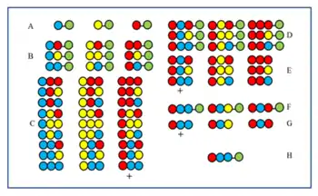 Positional scanning was introduced independently by Furka et al.[28] and Pinilla et al.[29] The method is based on the synthesis and testing of series of sublibraries. in which a certain sequence position is occupied by the same amino acid. The figure shows the nine sublibraries (B1-D3) of a full peptide trimer library (A) made from three amino acids. In sublibraries there is a position which is occupied by the same amino acid in all components. In the synthesis of a sublibrary the support is not divided and only one amino acid is coupled to the whole sample. As a result one position is really occupied by the same amino acid in all components. For example in the B2 sublibrary position 2 is occupied by the „yellow” amino acid in all the nine components. If in a screening test this sublibrary gives positive answer it means that position 2 in the active peptide is also occupied by the „yellow” amino acid. The amino acid sequence can be determined by testing all the nine (or sometime less) sublibraries.