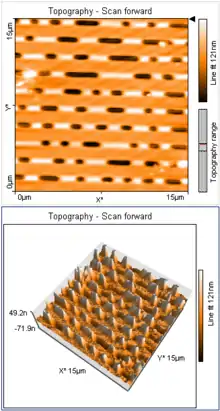 CD data is represented as tiny indentations known as pits, encoded in a spiral track moulded into the top of the polycarbonate layer. The areas between pits are known as lands. Each pit is approximately 100 nm deep by 500 nm wide, and varies from 850 nm to 3.5 µm in length.[4] The distance between the tracks (the pitch) is 1.6 µm.[5][6][7]