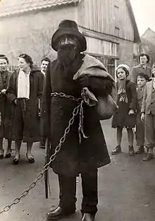 In the folklore of Germany, Knecht Ruprecht, which translates as Farmhand Rupert or Servant Rupert, is a companion of Saint Nicholas, and possibly the most familiar. Tradition holds that he was a man with a long beard, wearing fur or covered in pea-straw.[3] Knecht Ruprecht sometimes carried a long staff and a bag of ashes, and wore little bells on his clothes.[3]