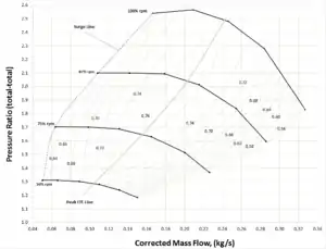 Parameter groups which are used as the basis for gas turbine engine compressor maps are total-pressure ratio (Pexit/Pinlet), , and efficiency. , for example, is simplified below while still being representative of mach number. Maps for other applications use head or discharge pressure and volume flow.[13]