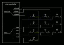 Computer keyboards include control circuitry to convert key presses into key codes[42] (usually scancodes) that the computer's electronics can understand. The key switches are connected via the printed circuit board in an electrical X-Y matrix where a voltage is provided sequentially to the Y lines and, when a key is depressed, detected sequentially by scanning the X lines.