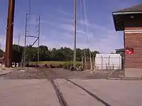 Tioga Street trackage curved to the right and up a ramp to the P&T. The old roadbed ramp is now weed-covered and new curbing and railing blocks the old right of way