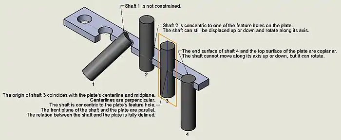 There are several constraints that may be applied between the entities or bodies depending much on their actual natural geometry; sometimes these are also referred to as ’’mates’’ and include: collinearity, perpendicularity, tangency, symmetry, coincidency and parallelity among other ways of establishing the orientation of the entity. Also, a constraint on two (or more) lines may be added so these are equal in length; in the same manner, the diameter of circles can be set to have the same dimension. Moreover, a solid model can also be set to be locked or fixed in space. Depending on the program, the terminology used in the application may differ.