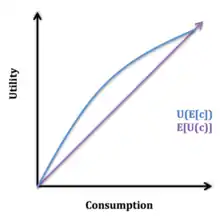 The graph below illustrates the expected utility model, in which U(c) is increasing in and concave in c. This shows that there are diminishing marginal returns associated with consumption, as each additional unit of consumption adds less utility. The expected utility model states that individuals want to maximize their expected utility, as defined as the weighted sum of utilities across states of the world. The weights in this model are the probabilities of each state of the world happening.[1] According to the "more is better" principle, the first order condition will be positive; however, the second order condition will be negative, due to the principle of diminishing marginal utility.[2] Due to the concave actual utility, marginal utility decreases as consumption increase; as a result, it is favorable to reduce consumption in states of high income to increase consumption in low income states.